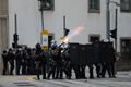 Riot control group of Rio de Janeiro Police in confrontation with protesters in the historical center of the city.