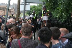 In the United Kingdom, usually when large demonstrations take place that are deemed unstable, the territorial police force responsible for the demonstration in that area will usually deploy Police Support Unit personnel who are trained in riot tactics, along with normal divisional officers. If the demonstration turns violent, police will seal roads and other exits to contain protesters in a single area (known as kettling) to prevent widespread damage and wait until the protesters tire. These tactics were seen during the 2009 G-20 London summit protests and the 2010 student protests in London. Tear gas and other more offensive tactics are used as a last resort. Throughout police will be videoing or photographing protesters for future arrests, "snatch squad" tactics might also be used where several police officers, usually in protective riot gear, rush forwards, occasionally in flying wedge formation to break through the front of a crowd, with the objective of snatching one or more individuals from a riot that are attempting to control the demonstration at which they are present; the target may be a leader or a speaker, or someone who seems to be leading the crowd. This tactic was used in the 2011 England Riots, most notably by Greater Manchester Police who deployed this tactic in Manchester city centre on 9 August 2011.[citation needed]