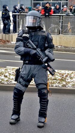 For protection, officers that are trained in police anti-riot schools performing riot control will often wear protective helmets and carry riot shields. These are designed to protect the wearer from those dangers that come from direct melee and hurled objects such as bottles and bricks. The gear frequently worn by riot control officers protects the entire body with no vulnerable spots to exploit. For example, the helmets worn by riot control officers have an additional outward-extending part that protects the back of the neck from assault. To provide even greater protection, the protective equipment often provides ballistic protection. If tear gas or other riot control agents are to be used, gas masks may also be worn.