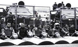 Defensive line of "Berkut" unitmen in riot gear by the Cabinet of Ministers building in Kyiv during 2013 Euromaidan protests.
