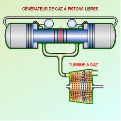 After the success of the free-piston air compressor, a number of industrial research groups started the development of free-piston gas generators. In these engines there is no load device coupled to the engine itself, but the power is extracted from an exhaust turbine. The turbine's rotary motion can thus drive a pump, propeller, generator, or other device.