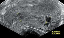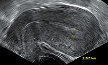 An incomplete miscarriage occurs when some products of conception have been passed, but some remains inside the uterus.[96] However, an increased distance between the uterine walls on transvaginal ultrasonography may also simply be an increased endometrial thickness and/or a polyp. The use of a Doppler ultrasound may be better in confirming the presence of significant retained products of conception in the uterine cavity.[97] In cases of uncertainty, ectopic pregnancy must be excluded using techniques like serial beta-hCG measurements.[97]