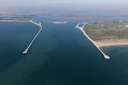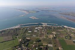 To the north of the inlet (Treporti), a small craft harbour consisting of two basins communicating through a lock, will allow small craft and emergency vessels to shelter and transit when the gates are raised. The sea-side basin was temporarily drained and sealed for use as the site to construct the gate housing structures for this barrier. Once the housing structures had been completed, the area was flooded with water to allow the housing structures to be floated out.