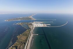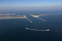 Outside the inlet, a 1,000-metre (3,300 ft) long curved breakwater is almost complete.[when?]