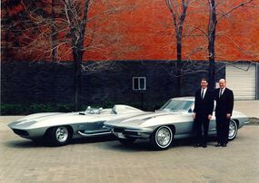 The second generation (C2) Corvette, which introduced Sting Ray to the model, continued with fiberglass body panels, and overall, was smaller than the first generation. The car was designed by Larry Shinoda with major inspiration from a previous concept design called the "Q Corvette," which was created by Peter Brock and Chuck Pohlmann under the styling direction of Bill Mitchell.[30][31] Earlier, Mitchell had sponsored a car known as the "Mitchell Sting Ray" in 1959 because Chevrolet no longer participated in factory racing. This vehicle had the largest effect on the styling of this generation, although it had no top and did not give away what the final version of the C2 would look like.[32] The third inspiration was a mako shark Mitchell had caught while deep-sea fishing.[33]