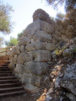 The remnants of ancient Amos is centered on the elongated hill of Asarcık at Hisarburnu ("fortress point"), just above the gulf of Marmaris. The city wall is made of coursed polygonal masonry dated to the Hellenistic period, and is fairly well preserved on the north slope where walls and towers still stand 3–4 metres high.[2] The wall on the south reach has almost disappeared due to erosion. Five towers are preserved, all of which are solid except for one. There is one gate in the northern wall, which is probably the main city gate. On the basis of the type of masonry used, the construction of the original wall has been dated to the 4th century B.C.E.[4][5]