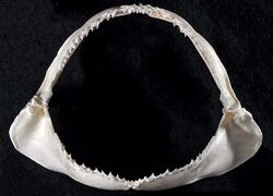 The school shark is a small, shallow-bodied shark with an elongated snout. The large mouth is crescent-shaped and the teeth are of a similar size and shape in both jaws. They are triangular-shaped, small, and flat, set at an oblique angle facing backwards, serrated and with a notch. The spiracles are small. The first dorsal fin is triangular with a straight leading edge and is set just behind the pectoral fins. The second dorsal fin is about the same size as the anal fin and is set immediately above it. The terminal lobe of the caudal fin has a notch in it and is as long as the rest of the fin. School sharks are dark bluish grey on their upper (dorsal) surfaces and white on their bellies (ventral surface). Juveniles have black markings on their fins. Mature sharks range from 135 to 175 cm (53 to 69 in) for males and 150 to 195 cm (59 to 77 in) for females.[4][5]