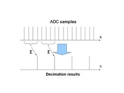 From Handwiki In digital signal processing, decimation is the process of reducing the sampling rate of a signal.[1][2][3] The term downsampling usually refers to one step of the process, but sometimes the terms are used interchangeably.[4][5] Complementary to upsampling, which increases sampling rate, decimation is a specific case of sample rate conversion in a multi-rate digital signal processing system. A system component that performs decimation is called a decimator.[2] When decimation is performed on a sequence of samples of a signal or other continuous function, it produces an approximation of the sequence that would have been obtained by sampling the signal at a lower rate (or density, as in the case of a photograph). The decimation factor is usually an integer or a rational fraction greater than one. This factor multiplies the sampling interval or, equivalently, divides the sampling rate. For example, if compact disc audio at 44,100 samples/second is decimated by a factor of 5/4, the resulting sample rate is 35,280.