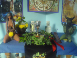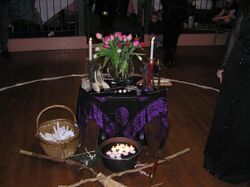 These rites often include a special set of magical tools. These usually include a knife called an athame, a wand, a pentacle and a chalice, but other tools include a broomstick known as a besom, a cauldron, candles, incense and a curved blade known as a boline. An altar is usually present in the circle, on which ritual tools are placed and representations of the God and the Goddess may be displayed.[97] Before entering the circle, some traditions fast for the day, and/or ritually bathe. After a ritual has finished, the God, Goddess, and Guardians are thanked, the directions are dismissed and the circle is closed.[98]