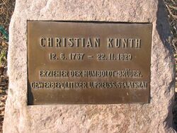From Handwiki Gottlob Johann Christian Kunth (12 June 1757 in Baruth – 22 November 1829 in Berlin) was a German politician and educator. Today he is known above all as the tutor and fatherly friend of the brothers Wilhelm and Alexander von Humboldt.