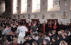The Greaze has been held "up School" (in the School Hall) on Shrove Tuesday since at least 1753.[93] The head cook ceremoniously tosses a horsehair-reinforced pancake over a high bar, which was used from the 16th century to curtain off the Under School from the Great School. Members of the school fight for the pancake for one minute, watched over by the Dean of Westminster (as Chairman of the Governors), the headmaster, and the upper years' groups of the school[94] and distinguished or even occasionally royal visitors. The pupil who gets the largest weight is awarded a gold sovereign (promptly redeemed for use next year), and the Dean begs for a half-holiday for the whole school. Weighing scales are on hand in the event of a dispute. A cook who failed to get the pancake over the bar after three attempts would formerly have been "booked" or pelted with Latin primers, but that tradition has long lapsed.[95][96]