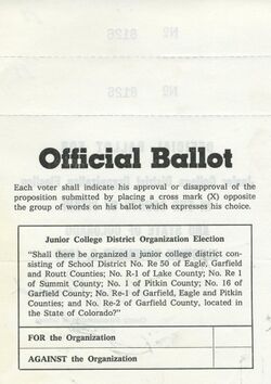 On November 2, 1965,[8] voters of five Colorado counties approved the formation of a college district including the Eagle, Garfield, Routt, Lake, Summit and Pitkin counties. The junior college plan was unanimously approved by the State Board of Education and the name "Colorado Mountain College", suggested by the governing committee member, Harold Koonce, was immediately adopted.