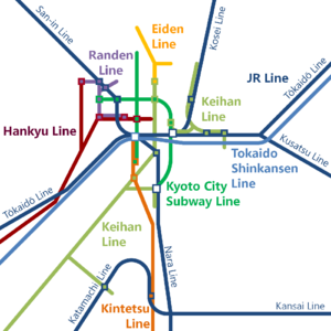 The Keihan Electric Railway, the Hankyu Railway, and other rail networks also offer frequent services within the city and to other cities and suburbs in the Kinki region. Although Kyoto does not have its own commercial airport, the limited express Haruka operated by JR West carries passengers from Kansai International Airport to Kyōto Station in 73 minutes.[39]