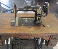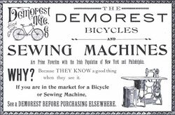Around 1883, Gerrit S. Scofield & Frank M. Scofield (advertising agents from New York) bought the Demorest brand and the sewing machine business (the Demorests retained the magazine business), and constructed a factory in Williamsport, Pennsylvania (in Lycoming County).[7][12] At the urging of the newly established Williamsport Board of Trade, citizens invested United States dollar 100, 000 in the new manufacturing facility, which employed 250 people.[7] The factory produced 50 to 60 sewing machines per day.[13] With the development of the "New York Bicycle" in 1891 (designed by employee S. H. Ellis), the company diversified its product offerings.[7][13] Until the early 1900s, the factory produced sewing machines, bicycles, typewriters, opera chairs and other products.[6][7][13]