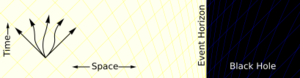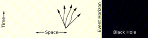 As predicted by general relativity, the presence of a mass deforms spacetime in such a way that the paths taken by particles bend towards the mass.[86] At the event horizon of a black hole, this deformation becomes so strong that there are no paths that lead away from the black hole.[87]