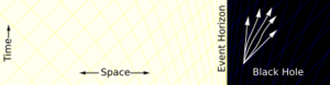 The modern theory of gravity, general relativity, discredits Michell's notion of a light ray shooting directly from the surface of a supermassive star, being slowed down by the star's gravity, stopping, and then free-falling back to the star's surface.[16] Instead, spacetime itself is curved such that the geodesic light travels on never leaves the surface of the "star" (black hole).