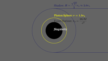 The photon sphere is a spherical boundary of zero thickness in which photons that move on tangents to that sphere would be trapped in a circular orbit about the black hole. For non-rotating black holes, the photon sphere has a radius 1.5 times the Schwarzschild radius. Their orbits would be dynamically unstable, hence any small perturbation, such as a particle of infalling matter, would cause an instability that would grow over time, either setting the photon on an outward trajectory causing it to escape the black hole, or on an inward spiral where it would eventually cross the event horizon.[113]