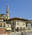 The Ottoman conquest also brought social, cultural and linguistic changes into the Albanian-speaking world. From the fifteenth century onward words from Ottoman Turkish entered the Albanian language.[83] A corpus of poets and other Muslim Albanian authors wrote in Ottoman Turkish, Arabic, Persian or in the Albanian language in Arabic script (aljamiado) encompassing narrative prose, poetry, reflective works on religion and socio-political situations and so on.[83][84] Prominent amongst these authors were Yahya bey Dukagjini, Haxhi Shehreti or bejtexhinj poets like Nezim Frakulla, Muhamet Kyçyku, Sulejman Naibi, Hasan Zyko Kamberi, Haxhi Ymer Kashari and others.[83] Apart from Elbasan founded (1466) around a fortress, towns and cities in Albania underwent change as they adopted Ottoman architectural and cultural elements.[18][85] Some settlements with the construction of buildings related to religion, education and social purposes like mosques, madrassas, imarets and so on by the Ottoman Muslim Albanian elite became new urban centres like Korçë, Tiranë and Kavajë.[85] Meanwhile, older urban centres such as Berat attained mosques, hamams (Ottoman bathhouses), madrasas (Muslim religious schools), coffee houses, tekes and became known for poets, artists and scholarly pursuits.[83] Unlike Kosovo or Macedonia, architecturally Albania's Ottoman Muslim heritage was more modest in number, though prominent structures are the Mirahori Mosque in Korçë (built 1495–96), Murad Bey Mosque in Krujë (1533–34), Lead Mosque in Shkodër (1773–74), Et'hem Bey Mosque in Tiranë (begun 1791–94; finished 1820–21) and others.[86][87]