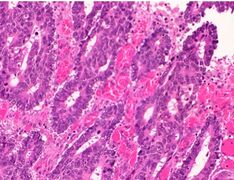 The histopathology of colorectal cancer of the adenocarcinoma type involves analysis of tissue taken from a biopsy or surgery. A pathology report contains a description of the microscopical characteristics of the tumor tissue, including both tumor cells and how the tumor invades into healthy tissues and finally if the tumor appears to be completely removed. The most common form of colon cancer is adenocarcinoma, constituting between 95%[2] and 98%[3] of all cases of colorectal cancer. Other, rarer types include lymphoma, adenosquamous and squamous cell carcinoma. Some subtypes have been found to be more aggressive.[4]