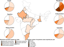 Mycetoma is endemic in some regions of the tropics and subtropics.[2] India, Sudan and Mexico are most affected.[2]