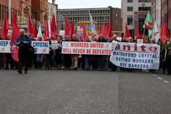 On 5 January 2009, Waterford Wedgwood entered receivership.[74] On 30 January, workers at the Waterford Crystal plant in Kilbarry were told they would be losing their jobs. A statement issued by the receiver, Deloitte's David Carson, confirmed that, of the 670 employees, 480 of them would be laid off.[75] The workers responded angrily to this unexpected decision and at least 100 of them began an unofficial sit-in in the visitors' gallery at the factory that night.[75] They insisted they would refuse to leave until they had met with Carson.[75] Following the revelations, there was a minor scuffle during which the main door to the visitors' centre was damaged.[75] Local Sinn Féin Councillor Joe Kelly was amongst those who occupied the visitors' gallery.[75] A meeting held the following day did little to resolve the conflict,[76] with the sit-in continuing for almost two months until 22 March.[77]