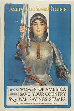 World War I-era poster urges to American women to buy War Saving Stamps by using Joan of Arc as a symbol of female patriotism. Issued by the United States Treasury Department; artist: Haskell Coffin.