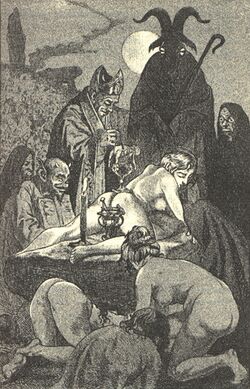 A reaction to this was the Taxil hoax in 1890s France, where an anti-clerical writer Léo Taxil (aka Marie Joseph Gabriel Antoine Jogand-Pagès), publicly converted to Catholicism and the published several works alleging to expose the Satanic doings of Freemasons. In 1897, Taxil called a press conference promising to introduce a key character of his stories but instead announced that his revelations about the Freemasons were made up, and thanked the Catholic clergy for helping to publicize his stories.[70] Nine years later he told an American magazine that at first he thought readers would recognize his tales as obvious nonsense, "amusement pure and simple", but when he realized they believed his stories and that there was "lots of money" to be made in publishing them, he continued to perpetrate the hoax.[71] Around the same time, another convert to Catholicism Joris-Karl Huysmans, also helped promote the concept of active Satanist groups in his 1891 work Là-bas (Down There). Huysmans "helped to cement" the idea the black mass as Satanic rite and inversion of the Roman Catholic mass, with a naked woman for an altar.[1] (Unlike Taxil, his conversion was apparently genuine and his book was published as fiction.)