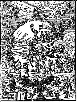 The early modern period also saw fear of Satanists reach its "historical apogee" in the form of the witch trials of the fifteenth to the eighteenth centuries,[57] when between 30,000 and 50,000 were executed as accused Satanic witches.[57] This came about as the accusations which had been leveled at medieval heretics, among them that of devil-worship, were applied to the pre-existing idea of the witch, or practitioner of malevolent magic.({{{1}}}, {{{2}}}) The idea of a conspiracy of Satanic witches was developed by educated elites, although the concept of malevolent witchcraft was a widespread part of popular belief, and folkloric ideas about the night witch, the wild hunt, and the dance of the fairies were incorporated into it.[58] The earliest trials took place in Northern Italy and France, before spreading it out to other areas of Europe and to Britain's North American colonies, being carried out by the legal authorities in both Catholic and Protestant regions.[57] Most historians agree that the majority of those persecuted in these witch trials were innocent of any involvement in Devil worship.[59] However, in their summary of the evidence for the trials, the historians Geoffrey Scarre and John Callow thought it "without doubt" that some of those accused in the trials had been guilty of employing magic in an attempt to harm their enemies and were thus genuinely guilty of witchcraft.[60]