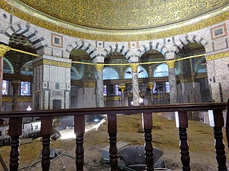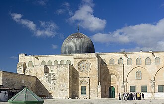 The Al-Aqsa Mosque marks the location where Muhammad supposedly arrived in Jerusalem, and until Muhammad's exile to Medina, this is the location Muslims turned to during prayer.[17] The Dome of the Rock, meanwhile, was built atop the site of the former Second Jewish Temple, and it is intended to mark the place where Muhammad ascended into Heaven.[18]