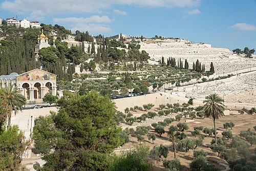 The Mount of Olives is also host to a wide variety of different Christian church buildings. The Catholic Church of All Nations site is built near the Catholic Church's accepted location for Gethsemane, and it contains a rock upon which Jesus supposedly knelt to pray.[62] The Chapel of the Ascension marks the location where Jesus supposedly rose into Heaven after being ressurected.[63] There's also a tomb believed by Eastern Christians to be the tomb of the Virgin Mary, although its authenticity is extremely questionable.[64] Perhaps the most distinctive Christian church is the Russian Church of Mary Magdalene, owned by the Russian Orthodox Church and notable for its seven gilded onion domes.[65] Finally, there's the Brigham Young University Jerusalem Center, which the Mormons were only allowed to build after promising not to proselytize in Jerusalem.[66]