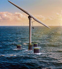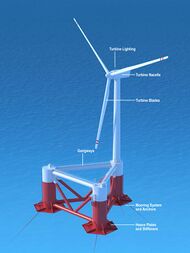 A floating wind turbine is an offshore wind turbine mounted on a floating structure that allows the turbine to generate electricity in water depths where fixed-foundation turbines are not feasible.[1][2] Floating wind farms have the potential to significantly increase the sea area available for offshore wind farms, especially in countries with limited shallow waters, such as Spain, Portugal, Japan, France and the United States' West Coast. Locating wind farms further offshore can also reduce visual pollution,[2] provide better accommodation for fishing and shipping lanes,[3][4] and reach stronger and more consistent winds.[5]