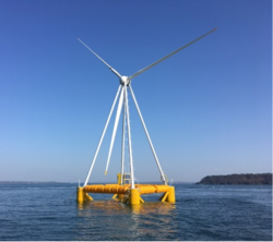 Eolink floating wind turbine is a single point mooring system technology. The patented structure of this French company based in Plouzané is a semi-submersible floating hull with a 4 masts pyramidal structure. The structure supports the turbine by 2 upwind and 2 downwind masts. It gives more clearance for the blades and distributes stress. Unlike most of the floating wind turbines, the turbine rotates around its single mooring point to face the wind. The pivot point ensures the mechanical and electrical link between the turbine and the sea floor. Eolink grid connected its first one-tenth scale demonstrator in April 2018.[105]
