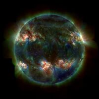 X-ray astronomy uses X-radiation, produced by extremely hot and high-energy processes. Since X-rays are absorbed by the Earth's atmosphere, observations must be performed at high altitude, such as from balloons, rockets, or specialized satellites. X-ray sources include X-ray binaries, supernova remnants, clusters of galaxies, and active galactic nuclei.[95] Since the Sun's surface is relatively cool, X-ray images of the Sun and other stars give valuable information on the hot solar corona.[96]