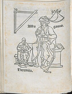 Portrait of Alfraganus in the Compilatio astronomica, 1493. Islamic astronomers collected and translated Indian, Persian and Greek texts, adding their own work.[35]