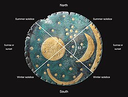 Megaliths from Nabta Playa, constructed by Neolithic populations,[9] located in Aswan, Upper Egypt. Excavations of the megalith structures were completed in 2008.[10]The Nebra sky disc (c. 1800–1600 BCE), found near a possibly astronomical complex, most likely depicting the Sun or full Moon, the Moon as a crescent, the Pleiades and the summer and winter solstices as strips of gold on the side of the disc,[11][12] with the top representing the horizon[13] and north.