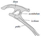 By contrast, ornithischians—"bird-hipped", from the Greek ornitheios (ὀρνίθειος) meaning "of a bird" and ischion (ἰσχίον) meaning "hip joint"—had a pelvis that superficially resembled a bird's pelvis: the pubic bone was oriented caudally (rear-pointing). Unlike birds, the ornithischian pubis also usually had an additional forward-pointing process. Ornithischia includes a variety of species that were primarily herbivores.