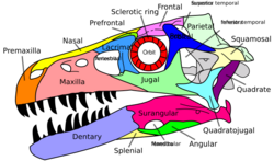 A variety of other skeletal features are shared by dinosaurs. However, because they either are common to other groups of archosaurs or were not present in all early dinosaurs, these features are not considered to be synapomorphies. For example, as diapsids, dinosaurs ancestrally had two pairs of Infratemporal fenestrae (openings in the skull behind the eyes), and as members of the diapsid group Archosauria, had additional openings in the snout and lower jaw.[32] Additionally, several characteristics once thought to be synapomorphies are now known to have appeared before dinosaurs, or were absent in the earliest dinosaurs and independently evolved by different dinosaur groups. These include an elongated scapula, or shoulder blade; a sacrum composed of three or more fused vertebrae (three are found in some other archosaurs, but only two are found in Herrerasaurus);[10] and a perforate acetabulum, or hip socket, with a hole at the center of its inside surface (closed in Saturnalia tupiniquim, for example).[33][34] Another difficulty of determining distinctly dinosaurian features is that early dinosaurs and other archosaurs from the Late Triassic epoch are often poorly known and were similar in many ways; these animals have sometimes been misidentified in the literature.[35]