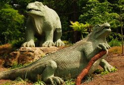 The first potential evidence for herding or flocking as a widespread behavior common to many dinosaur groups in addition to birds was the 1878 discovery of 31 Iguanodon, ornithischians that were then thought to have perished together in Bernissart, Belgium, after they fell into a deep, flooded sinkhole and drowned.[165] Other mass-death sites have been discovered subsequently. Those, along with multiple trackways, suggest that gregarious behavior was common in many early dinosaur species. Trackways of hundreds or even thousands of herbivores indicate that duck-billed (hadrosaurids) may have moved in great herds, like the American bison or the African springbok. Sauropod tracks document that these animals traveled in groups composed of several different species, at least in Oxfordshire, England,[166] although there is no evidence for specific herd structures.[167] Congregating into herds may have evolved for defense, for migratory purposes, or to provide protection for young. There is evidence that many types of slow-growing dinosaurs, including various theropods, sauropods, ankylosaurians, ornithopods, and ceratopsians, formed aggregations of immature individuals. One example is a site in Inner Mongolia that has yielded remains of over 20 Sinornithomimus, from one to seven years old. This assemblage is interpreted as a social group that was trapped in mud.[168] The interpretation of dinosaurs as gregarious has also extended to depicting carnivorous theropods as pack hunters working together to bring down large prey.[169][170] However, this lifestyle is uncommon among modern birds, crocodiles, and other reptiles, and the taphonomic evidence suggesting mammal-like pack hunting in such theropods as Deinonychus and Allosaurus can also be interpreted as the results of fatal disputes between feeding animals, as is seen in many modern diapsid predators.[171]