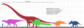 There were larger dinosaurs, but knowledge of them is based entirely on a small number of fragmentary fossils. Most of the largest herbivorous specimens on record were discovered in the 1970s or later, and include the massive Argentinosaurus, which may have weighed 80000 to 100000 kilograms (88 to 110 short tons) and reached lengths of 30 to 40 meters (98 to 131 ft); some of the longest were the 33.5-meter (110 ft) long Diplodocus hallorum[143] (formerly Seismosaurus), the 33-to-34-meter (108 to 112 ft) long Supersaurus,[150] and 37-meter (121 ft) long Patagotitan; and the tallest, the 18-meter (59 ft) tall Sauroposeidon, which could have reached a sixth-floor window. There were a few dinosaurs that was considered either the heaviest and longest. The most famous one include Amphicoelias fragillimus, known only from a now lost partial vertebral neural arch described in 1878. Extrapolating from the illustration of this bone, the animal may have been 58 meters (190 ft) long and weighed 122400 kg (269800 lb).[143] However, recent research have placed Amphicoelias from the long, gracile diplodocid to the shorter but much stockier rebbachisaurid. Now renamed as Maraapunisaurus, this sauropod now stands as much as 40 meters (130 ft) long and weigh as much as 120000 kg (260000 lb).[151][152] Another contender of this title includes Bruhathkayosaurus matleyi, an incredibly controversial taxon that was recently confirmed to exist after archived photos were uncovered.[153] Bruhathkayosaurus was a titanosaur and would have most likely weighed more than even Marrapunisaurus. Recent size estimates in 2023 have placed this sauropod reaching lengths of up to 44 m (144 ft) long and a colossal weight range of around 110000–170000 kg (240000–370000 lb), if these upper estimates up true, Bruhathkayosaurus would have rivaled the blue whale and Perucetus colossus as one of the largest animals to have ever existed.[154]