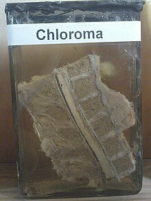 The condition now known as chloroma was first described by the British physician A. Burns in 1811,[15] although the term chloroma did not appear until 1853.[16] This name is derived from the Greek word chloros (green), as these tumors often have a green tint due to the presence of myeloperoxidase. The link between chloroma and acute leukemia was first recognized in 1902 by Dock and Warthin.[17] However, because up to 30% of these tumors can be white, gray, or brown rather than green, the more correct term granulocytic sarcoma was proposed by Rappaport in 1967[18] and has since become virtually synonymous with the term chloroma.