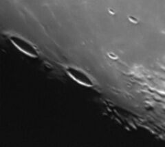 Krafft (left) and Cardanus (center) near the terminator, as viewed from Earth. Also visible is the Rima Cardanus between them and the crater Galilaei beyond.