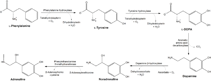 As noted, L-phenylalanine can be converted into L-tyrosine, utilizing the enzyme phenylalanine hydroxylase. In turn, L-tyrosine is converted to levodopa (L-DOPA) by the enzyme tyrosine hydroxylase. This can be further converted into dopamine, norepinephrine (noradrenaline), and epinephrine (adrenaline) (the latter three are known as catecholamines).