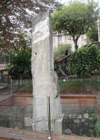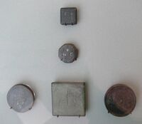 Model weights were made in lead, bronze, and glass and (less often) from gold and silver.[19] They came in various styles. Presently, archaeologists believe the bronze spheres sliced flat at top and bottom and marked with an omicron/upsilon date from the early 3rd to late 5th centuries, gradually being replaced by cubes marked with a gamma/omicron (𐆄) over the course of the 4th century.[19] In the second half of the 6th century, these were replaced by discs until at least the early 9th century[19] and possibly the 12th.[20] The glass weights had numerous advantages in manufacture and use[20] but seem to have disappeared following the loss of the empire's Syrian and Egyptian provinces in the 7th century.[21]