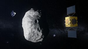 The American DART mission, launched on 24 November 2021 at 06:21 UTC by a Falcon 9 from Vandenberg Launch Station reached the binary asteroid (65803) Didymos on 26 September 2022, with impact at 23:16 UTC colliding with its Dimorphos satellite at a relative speed of about 6.6 km/s.[5] The impact must change the rotation (? orbital) period (11.9 hours) of Dimorphos around Didymos by 73 seconds minimum, which should be observed by terrestrial telescopes.