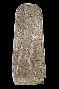 It has been argued that the theonyms Teshub and Baal were both used interchangeably to refer to the local weather god in Emar.[123] However, most likely, his principal name in this city was Adad, and Baal served only as an appellative.[124] It is possible that in the local pantheon, the relationship between him and Ashtart was imagined similar to the bond between Teshub and Šauška in Hurrian mythology, as evidence for alleged consort relation between them is lacking.[123]