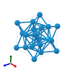 β-W has a cubic A15 structure with space group [math]\displaystyle{ Pm\bar{3}n }[/math], which belongs to the Frank–Kasper phases family. Each unit cell contains eight tungsten atoms. The structure can be seen as a cubic lattice with one atom at each corner, one atom in the center, and two atoms on each face. There are two inequivalent tungsten sites corresponding to Wyckoff positions [math]\displaystyle{ 2a }[/math] and [math]\displaystyle{ 6c }[/math], respectively. On the first site, Wyckoff position [math]\displaystyle{ 2a }[/math], each tungsten atom is bonded to twelve equivalent W atoms to form a mixture of edge- and face-sharing WW12 cuboctahedratungsten. On the second site, with Wyckoff position [math]\displaystyle{ 6c }[/math], each tungsten atom is bonded to fourteen neighboring tungsten atoms, and there is a spread of W–W bond lengths ranging from 2.54 to 3.12 Å.[12] The experimentally measured lattice parameter of β-W is 5.036 Å,[6] while the DFT calculated value is 5.09 Å.[12]