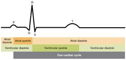 The cardiac cycle is the sequence of events in which the heart contracts and relaxes with every heartbeat.[11] The period of time during which the ventricles contract, forcing blood out into the aorta and main pulmonary artery, is known as systole, while the period during which the ventricles relax and refill with blood is known as diastole. The atria and ventricles work in concert, so in systole when the ventricles are contracting, the atria are relaxed and collecting blood. When the ventricles are relaxed in diastole, the atria contract to pump blood to the ventricles. This coordination ensures blood is pumped efficiently to the body.[7]