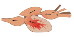 The heart evolved no less than 380 million years ago in fish.[149] Fish have what is often described as a two-chambered heart,[150] consisting of one atrium to receive blood and one ventricle to pump it.[151] However, the fish heart has entry and exit compartments that may be called chambers, so it is also sometimes described as three-chambered[151] or four-chambered,[152] depending on what is counted as a chamber. The atrium and ventricle are sometimes considered "true chambers", while the others are considered "accessory chambers".[153]