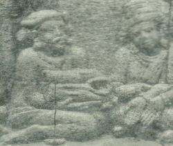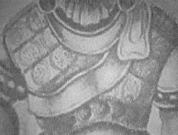 A suit of armor, or specifically cuirass,[7]:47 is depicted on the reliefs of the Divyavadana story in the Borobudur temple. In that story, it is said that Rudrayana sent a gift to king Bimbisara in the form of his famous cuirass which not only had miraculous powers but was also adorned with priceless gems.[8]:282 The cuirass is depicted as sleeveless and apparently closed in front.[9]:233, plate XXXVII