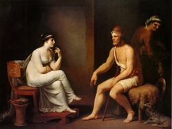 Another theme throughout the Odyssey is testing.[38] This occurs in two distinct ways. Odysseus tests the loyalty of others and others test Odysseus' identity. An example of Odysseus testing the loyalties of others is when he returns home.[38] Instead of immediately revealing his identity, he arrives disguised as a beggar and then proceeds to determine who in his house has remained loyal to him and who has helped the suitors. After Odysseus reveals his true identity, the characters test Odysseus' identity to see if he really is who he says he is.[38] For instance, Penelope tests Odysseus' identity by saying that she will move the bed into the other room for him. This is a difficult task since it is made out of a living tree that would require being cut down, a fact that only the real Odysseus would know, thus proving his identity.[38]